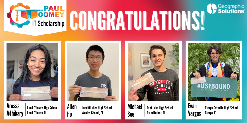 Each year, money is generously donated by Geographic Solutions’ employees to fund the Paul Toomey IT Scholarship. The amount is then matched by company Founder and President, Paul Toomey. With the money being collected through the end of November 2023, we sent out the call for applications early this year. The application process was open to the children of Geographic Solutions employees and all Hillsborough, Pasco and Pinellas County seniors. This year enough money was raised to award four scholarships – more than ever before! Each scholarship recipient received $3,800 which they can use towards credit hours, housing, or curriculum supplies.